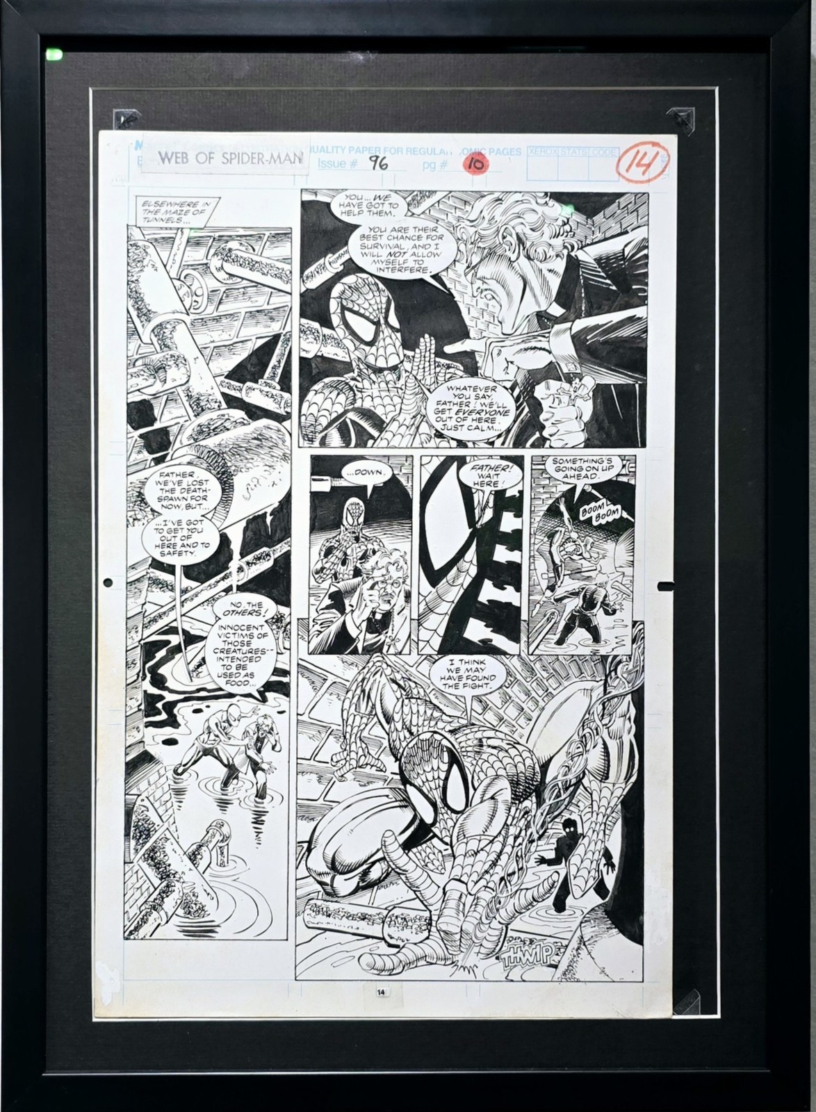 (cette planche) Dans les égouts de Manhattan, Spider-Man tente d’échapper aux Deathspawn pour sauver des otages destinés à ressusciter Deathwatch. Séparé de Ghost Rider et Blaze, il parvient à inonder les tunnels pour disperser les créatures.