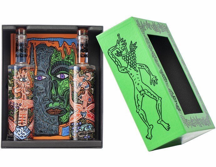 Une Vodka au flacon stylisé par Robert Combas issue de raisins bio et d’eau de source.